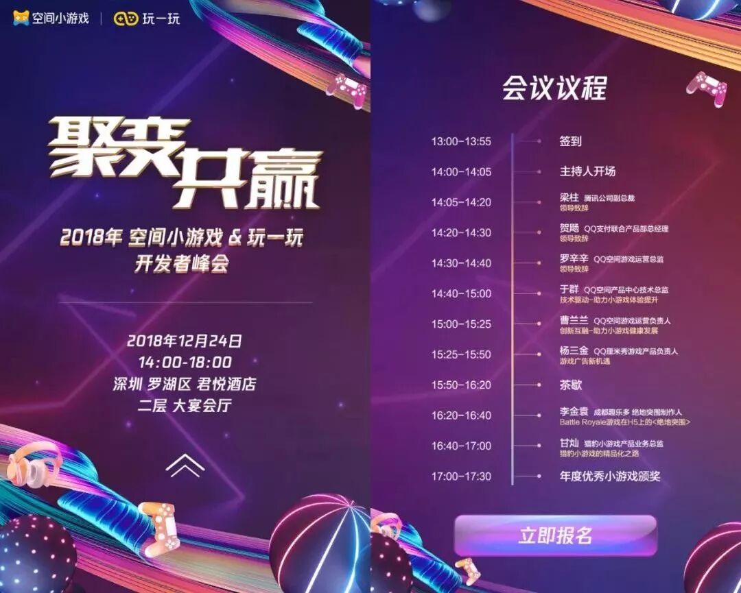 12月24日,2018年“空间小游戏&玩一玩开发者峰会”将在深圳举行,本次峰会主题为“聚变共赢”,峰会现场将围绕小游戏技术驱动、创新驱动等话题展开分析。腾讯公司副总裁、QQ空间游戏运营总监、QQ厘米秀游戏产品负责人等将出席该峰会。峰会当天还会颁发年度优秀小程序奖项。