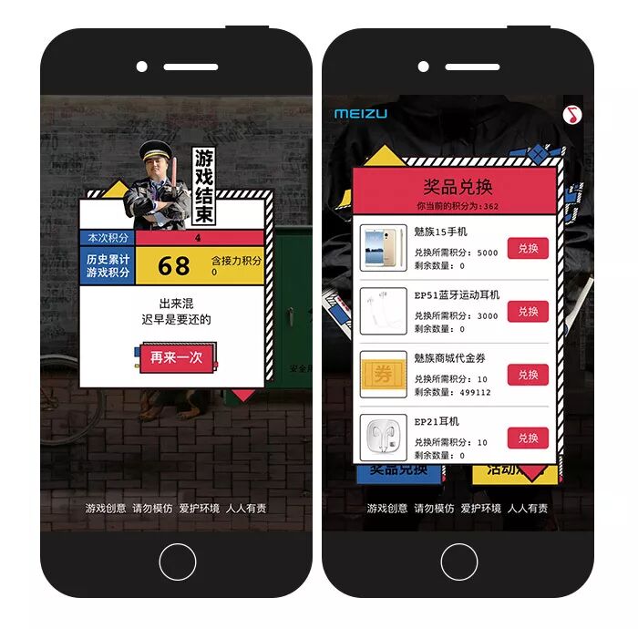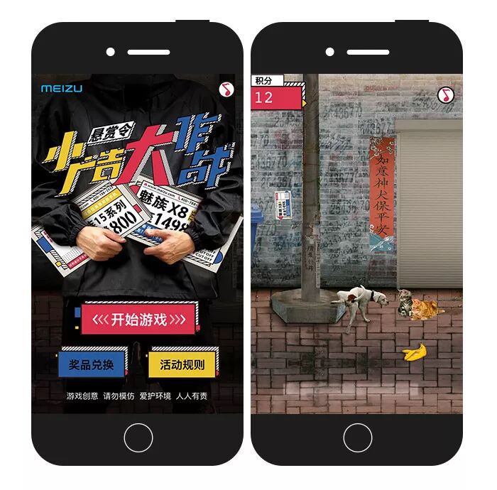 同时,魅族还上线了一支小广告大作战H5。点击画面即可贴海报赚取积分,累计的游戏积分可以用来兑换奖品。
