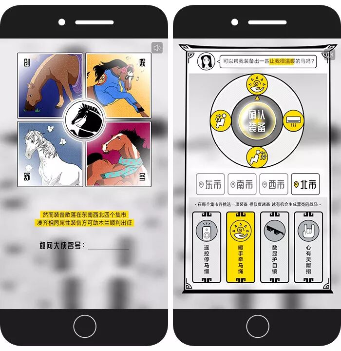 传说四大名马:赤兔、的卢、绝影、爪黄飞电,每一匹都有纵横千里的能力……12月27日,宝马中国发布插画风H5《为木兰配备宝马套装》,从《木兰辞》中引用代父从军的传统典故,让用户在线上为木兰选择装备,召唤战马。