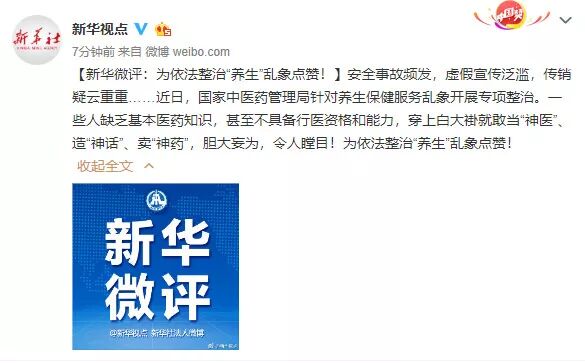 新华视点微博评论指出:安全事故频发,虚假宣传泛滥,传销疑云重重……近日,国家中医药管理局针对养生保健服务乱象开展专项整治。一些人缺乏基本医药知识,甚至不具备行医资格和能力,穿上白大褂就敢当“神医”、造“神话”、卖“神药”,胆大妄为,令人瞠目,为依法整治“养生”乱象点赞。