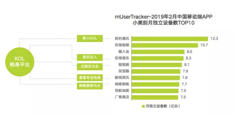 艾瑞联合IMS(天下秀)发布的《中国KOL营销策略白皮书》指出,现阶段移动互联网头部流量平台类别均有KOL栖身,2019年2月中国移动端月独立设备数排在前十位的App小类别平台中,即时通讯、在线音乐、短视频、新闻资讯和网络购物平台类别均有KOL。另外,通讯聊天和社交网络是每日用户使用次数最多的App类别,频次分别高达11.2和8.4。