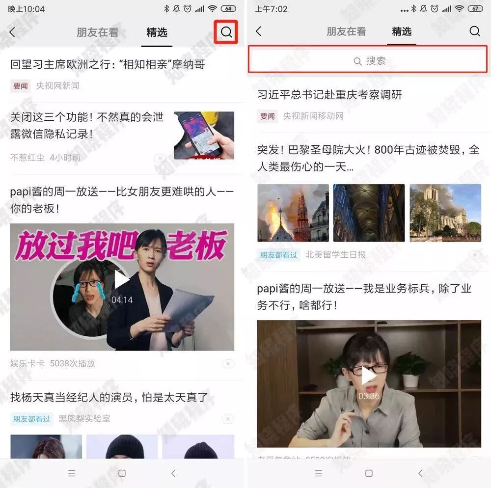 微信看一看「精选」本只有右上角的一个搜索符号。近日,有网友发现看一看「精选」内容流顶部也新增了一个搜索框,二者均可对看一看中的内容进行搜索。