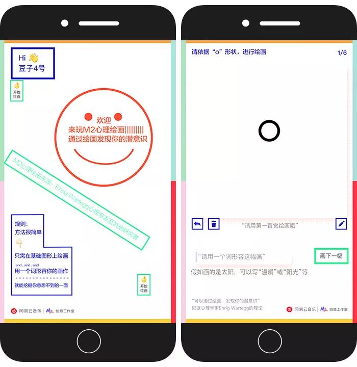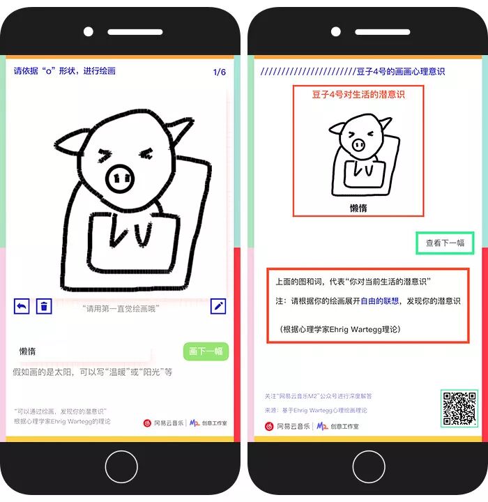 网易云音乐M2创意工作室根据心理学家 Ehrig Wartegg 的理论,推出了通过画画发现潜意识的测试类H5。