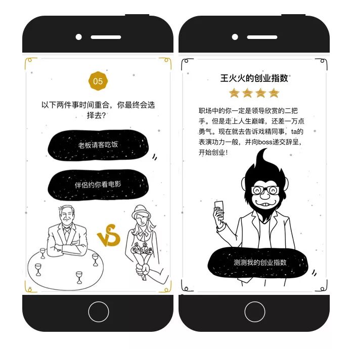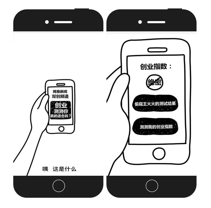 网易新闻为宣传自有栏目“双创频道”制作了一个充满趣味的H5,H5中的主角王火火无房、无车、无女友,加班后意外收到了老同学合伙创业的邀请。正当犹豫时,点开了网易新闻的创业指数测试。之后向BOSS递交辞呈,开始创业!