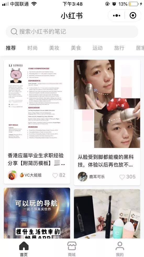 近日,小红书上线微信小程序商城。据了解,小红书微信小程序首页与小红书App首页相同,均显示的是用户分享笔记。同时小红书微信小程序也有商城,包含类目:美妆个护、服饰鞋包、母婴、家居生活、服装内衣、家电数码、保健品以及配饰等。