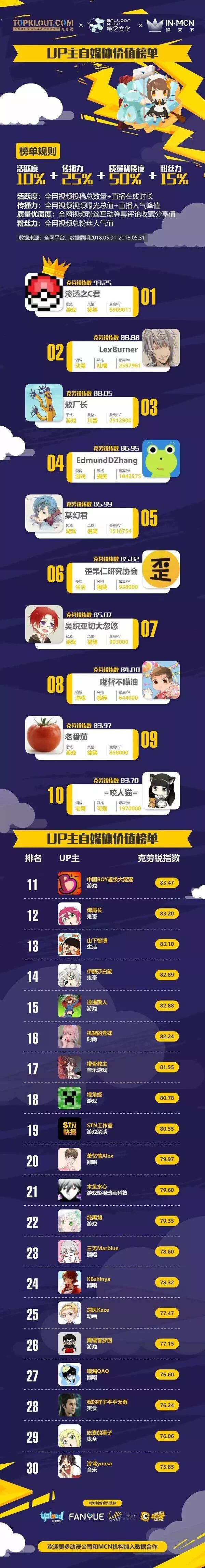 重磅首发!克劳锐&帛仑文化&映天下发布5月《UP主自媒体价值榜 》