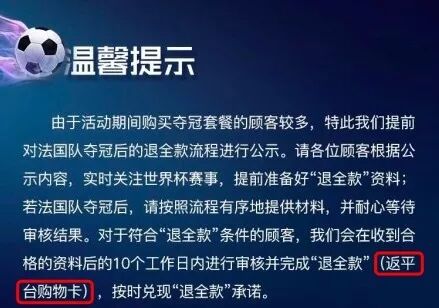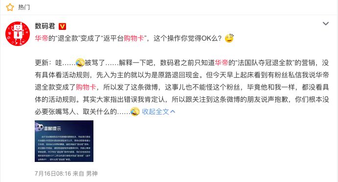 在大家都在称赞华帝花7900万打得一手好宣传的时候,华帝迅速的兑现了退全款的承诺,但对于活动期间在线上电商平台购买华帝“夺冠套餐”的顾客可获平台购物卡的形式,有不少网友指被当猴耍,然而之前华帝出得公告里就写清楚了返平台购物卡。