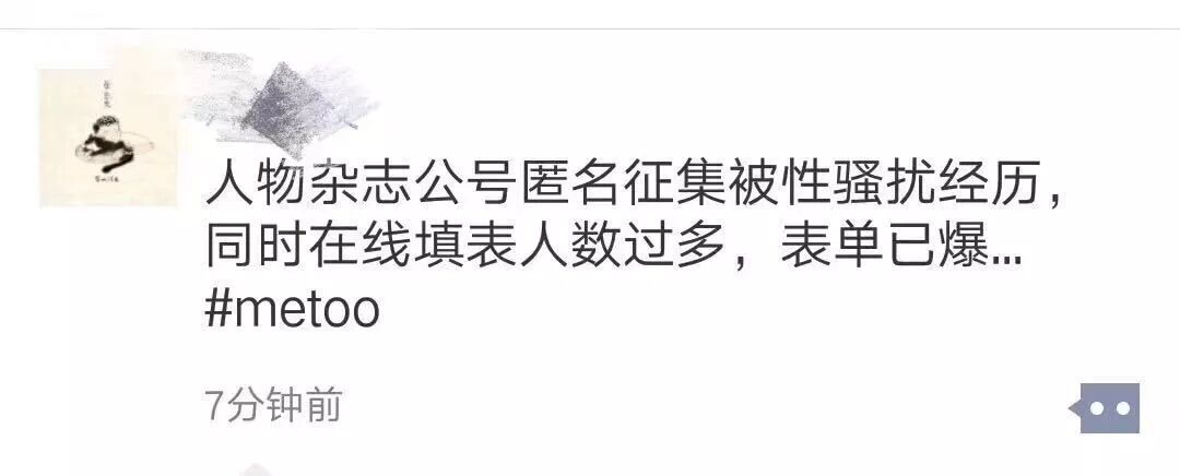 之前《人物》杂志公众号开展的匿名征集被性骚扰经历活动,因为同时在线填表人数过多而爆掉了。