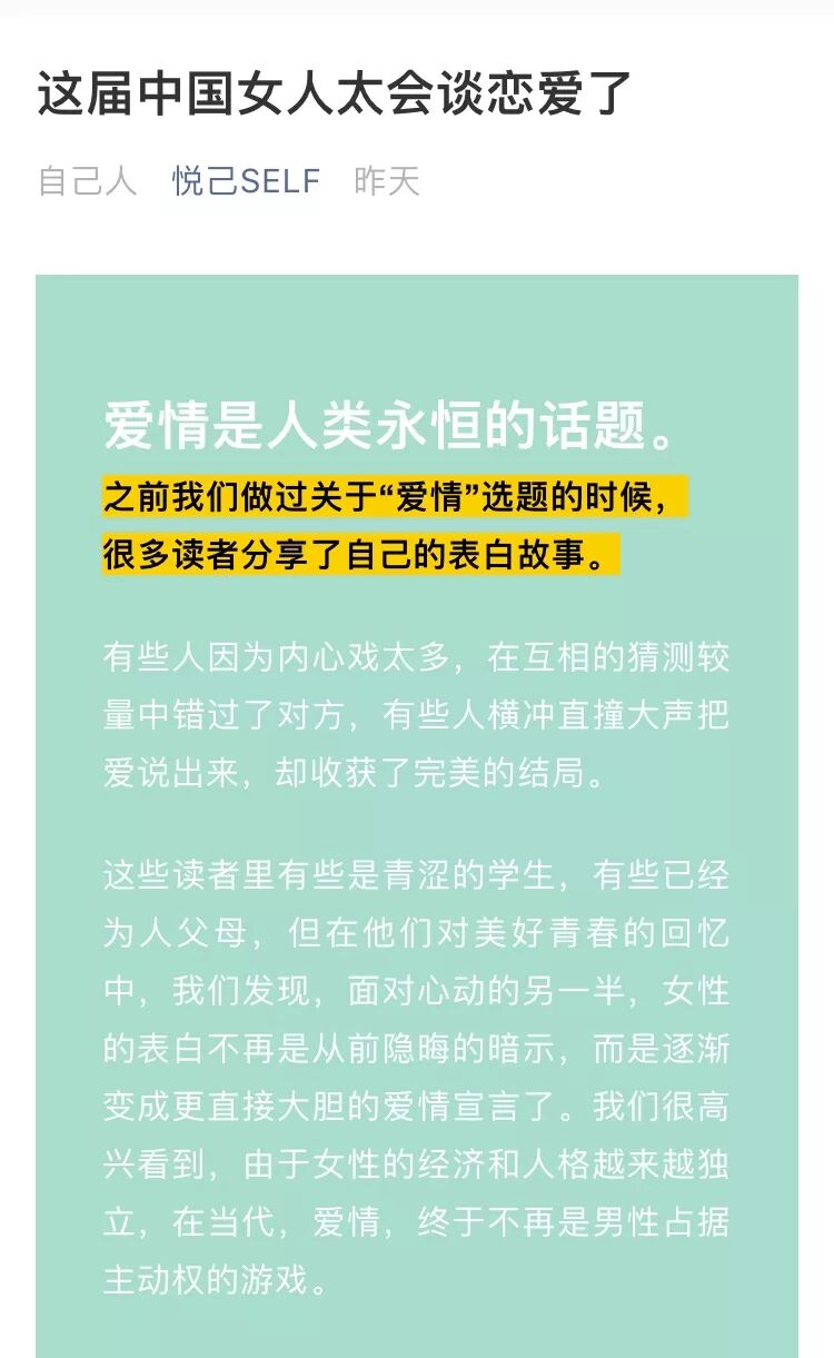 Valentino本次为锁定目标群体,也与时尚类账号悦己SELF进行了合作推广。悦己SELF作为传统纸媒的公众号,当前阅读量虽不足5W+,但其用户多为一二线城市关注时尚、主张宠爱自己的年轻都市女白领等新女性,在带货能力上也许不弱于10W+大号。