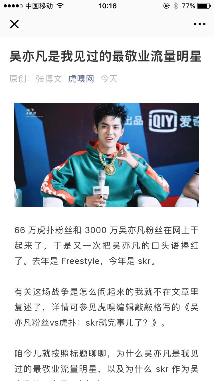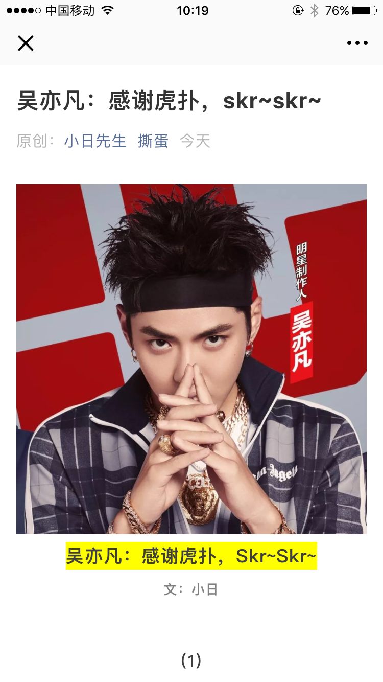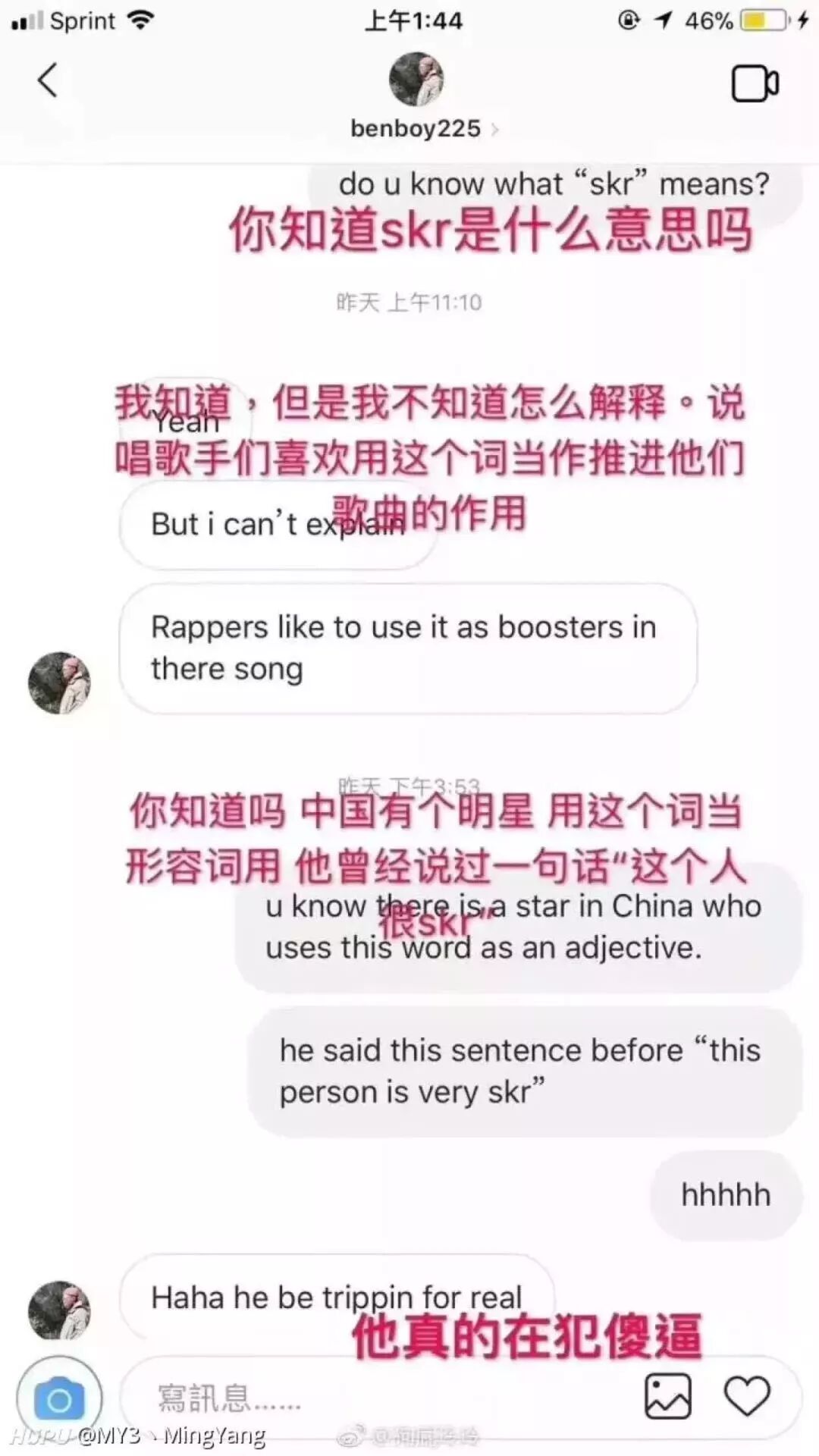 并在帖子里反驳吴亦凡在《中国新说唱》中大量使用Skr称赞选手,把它当成“牛批”的代名词的用法。
