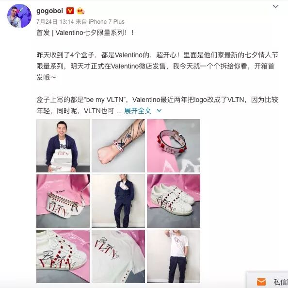 Valentino华伦天奴“Be my VLTN”七夕限定系列单品于2018年7月25日至7月31日期间在官方微信平台上限时独家发售,8月1日起才在北京、上海、香港三家精品门店独家发售。在微信限时发售期间,Valentino选择了新媒体social平台进行推广宣发。知名时尚博主gogoboi与微信开售的前一天在微博首发了该系列的产品图,目前止仅有127次转发,228条留言,804赞。