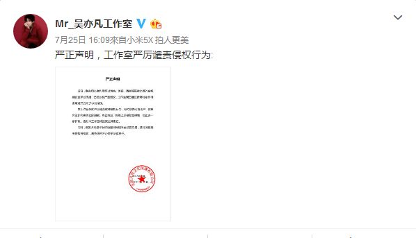 当天下午四点左右,@Mr_凡先生和@Mr_吴亦凡工作室前后发微博怒怼虎扑,并声明谴责侵权行为,表示或将进行法律追责。