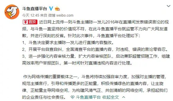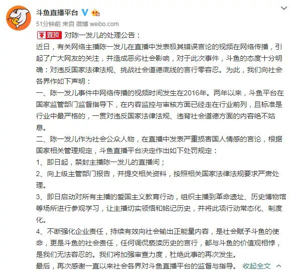 斗鱼公告称:有关网络主播陈一发儿在直播中发表极其错误言论的视频在网络传播,引起了广大网友的关注,并造成恶劣社会影响。即日起,禁封主播陈一发儿的直播间,启动对所有主播的爱国主义教育行动,组织主播到革命遗址、历史博物馆等场所进行参观学习,让主播切实领悟和铭记历史,并将此项行动常态化、制度化。