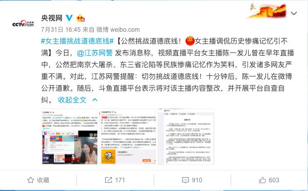 昨日江苏网警表示,接网友举报,斗鱼直播平台主播陈一发儿在早年直播过程中,将南京大屠杀、东三省沦陷等作为调侃的笑料,引发诸多网友不满。江苏网警在微博上实名@陈一发儿,提醒网络主播在直播过程中,应以身作则,切勿挑战道德底线、僭越法律红线,平台方也应加强管理。