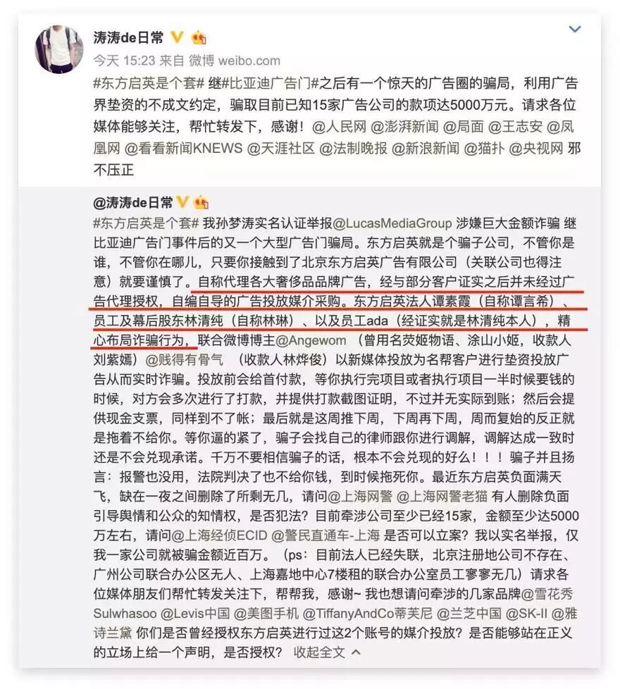 据受害人表示,东方启英自称是60多家客户的代理商,找受害人公司签约了300w的媒介投放,只投放@Angewom 和@贱得有骨气 两个kol,并且是在短时间投放20-30条,发布后以各种理由拖欠尾款。后受害人发现,KOL与东方启英或是诈骗伙伴关系。