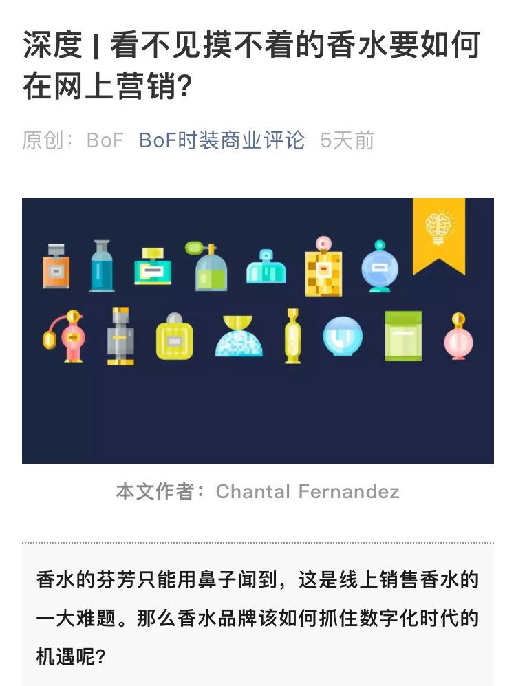以香水的深度营销为例, BoF时装商业评论在文章《深度 | 看不见摸不着的香水要如何在网上营销?》 这篇文章中,从品牌信任、视觉内容、技术三大方面讲述如何打破某些产品网上营销的困境。不光需要制作出彩的视觉内容,想要增强品牌的信息的传达功能,就要利用好技术比如 AR 带来的可能性。