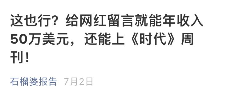 石榴婆报告也曾发布文章《这也行?给网红留言就能年收入50万美元,还能上<时代>周刊!》分析了各类网红的走红之路,甚至还能登上《时代》周刊。