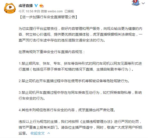 虎牙直播公告:禁止各种形式的网约车直播