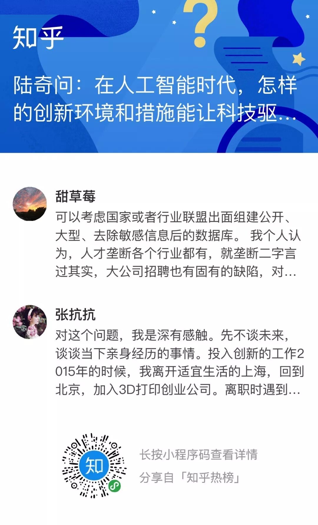 10月30日,继马化腾、李开复后,YC中国创始人兼CEO陆奇也现身知乎提问。他的问题是:“在人工智能时代,怎样的创新环境和措施能让更多科技驱动的创业公司成功,使其不再是大型科技公司的专利?”截至今天10:30,陆奇在知乎的提问已得到2487人的关注和102个回答。