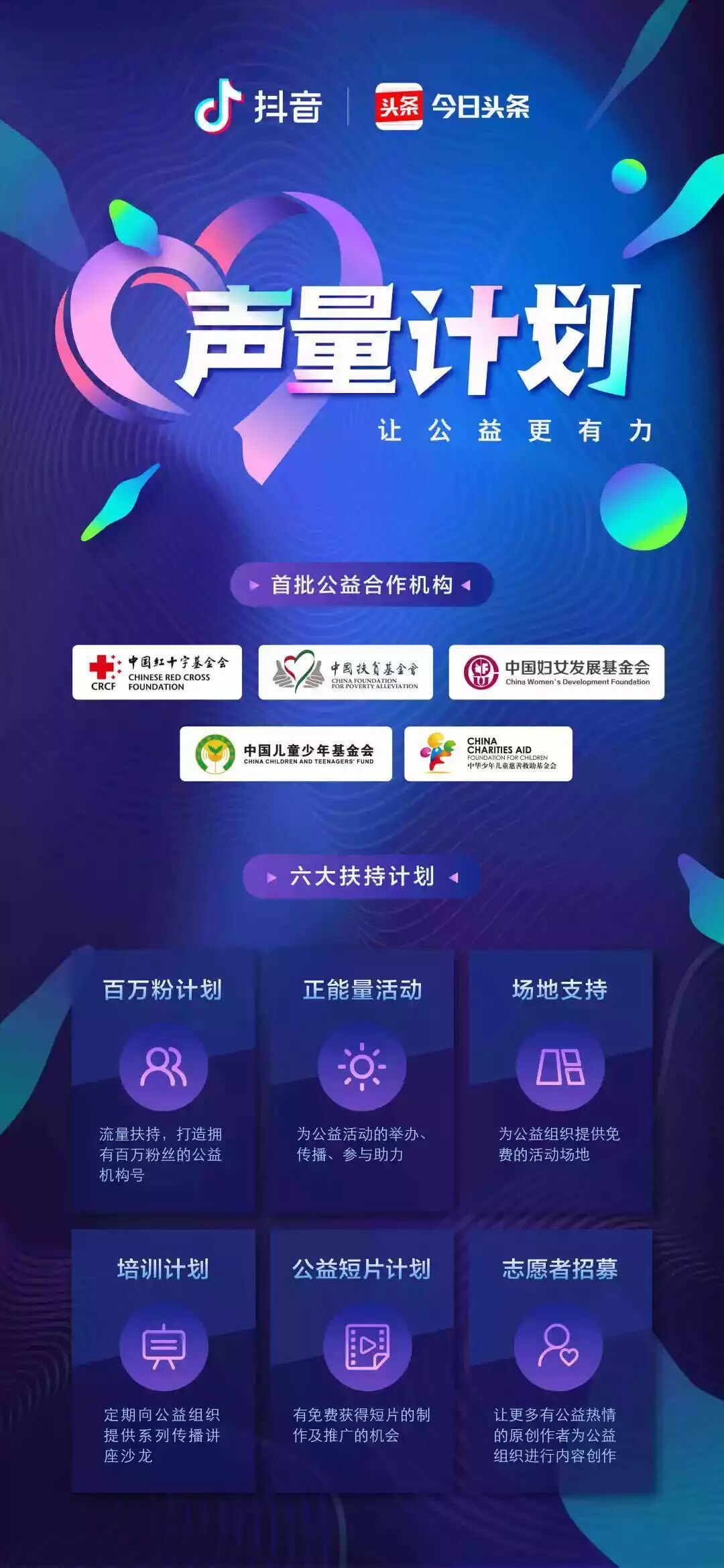 “声量计划”是抖音和今日头条联合发起的年度公益项目,包括“百万粉计划”、 “正能量活动”、“场地支持”、“培训计划”、“公益短片计划”、“志愿者招募”六大扶持计划。旨在帮助公益组织更好地找到受助对象、进行精准公益推广,并为公益组织传播公益项目提供流量支持和技术层面的指导。此次合作中,中国红十字基金会、中国扶贫基金会、中国妇女发展基金会、中国儿童少年基金会、中华少年儿童慈善救助基金会共计五家全国公募性基金会受邀成为了“声量计划”的首批合作伙伴。