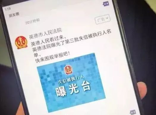 广东英德人民法院投放微信朋友圈广告,将欠钱不还的“失信人”信息,推送到全市 20 万人微信朋友圈。法院联合微信,根据地理位置、人口属性,锁定失信人周边人群,向其亲属、朋友,定向推送。